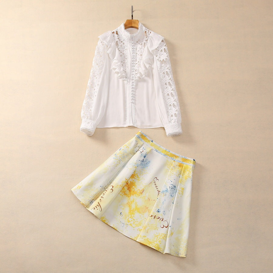 Silk Crinkle Silk Stitching Water Soluble Lotus Leaf Stand Collar Top A- Line Skirt Short Skirt Fashion Suit