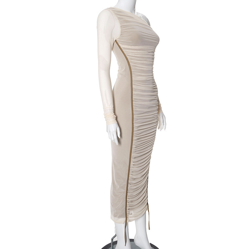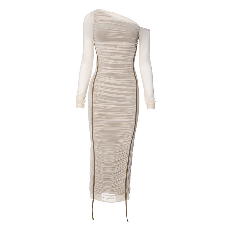 Women's Diagonal Collar Long Sleeve High Waist Mesh Dress