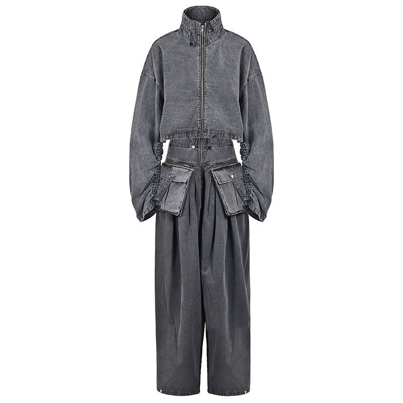 Women's Large Pocket Heavy Industry Denim Jacket Two-piece Set
